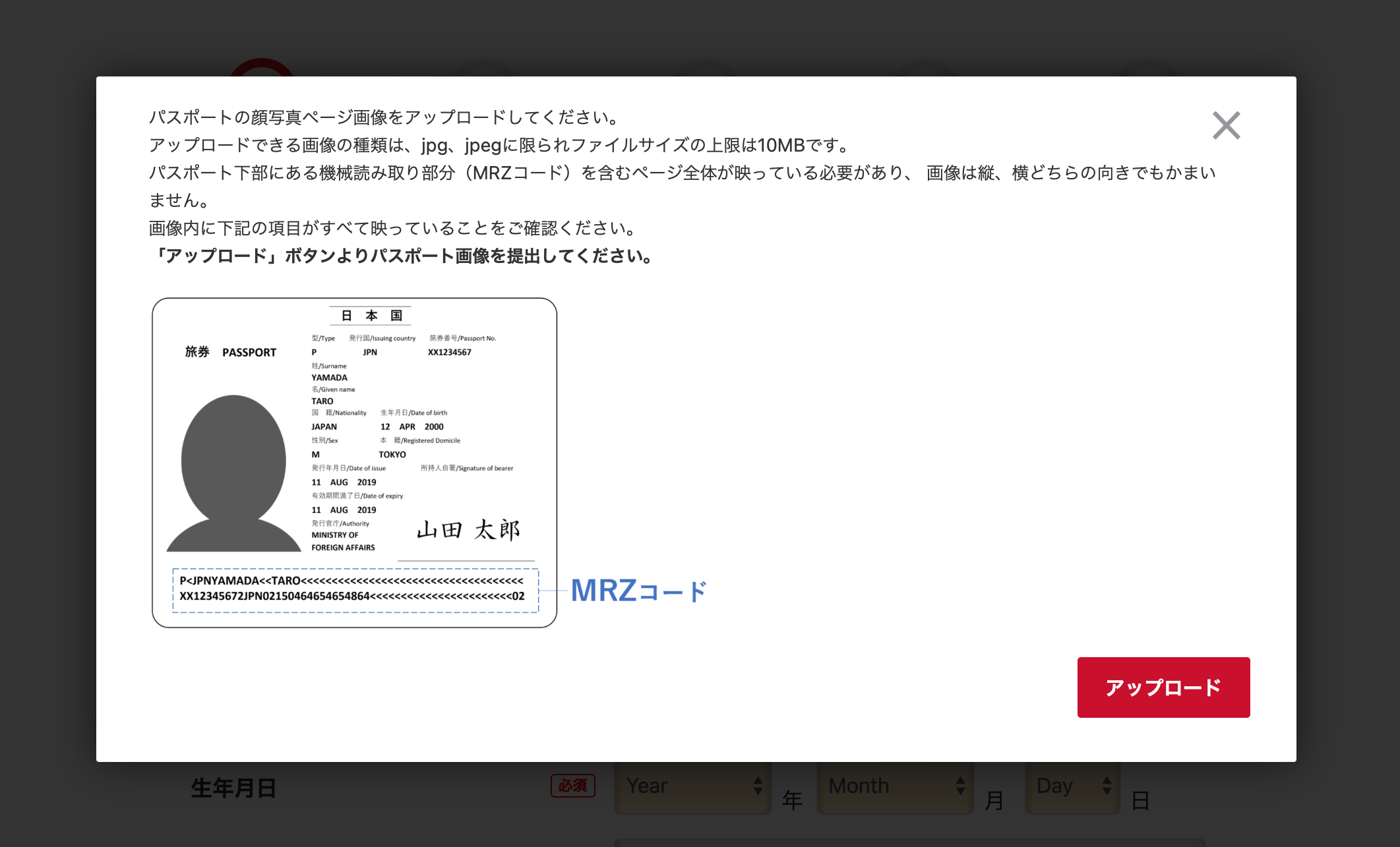 パスポートの顔写真ページの画像をアップロードしてください。 有効な画像のファイル形式はjpg、jpegに限られ、サイズは10MB以下のものをご使用ください。また、パスポート下部にあるMRZコードを含む全体が映っている必要があります。画像の向きは、縦、横どちらの向きでも問題ありません。