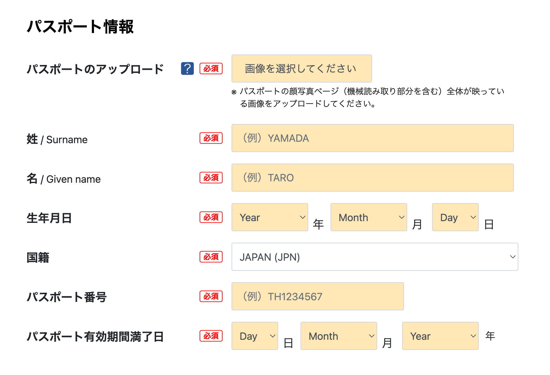 姓/名はいずれもパスポートに記載されているとおり、ローマ字(大文字)でご入力ください。姓/名の入力順やスペルミスがあった場合、申請が却下されるため注意が必要です。日本発行のパスポート番号は、アルファベット字2文字+数字7桁の合計9桁です。パスポート番号を入力後は、「有効期間満了日」を選択してください。