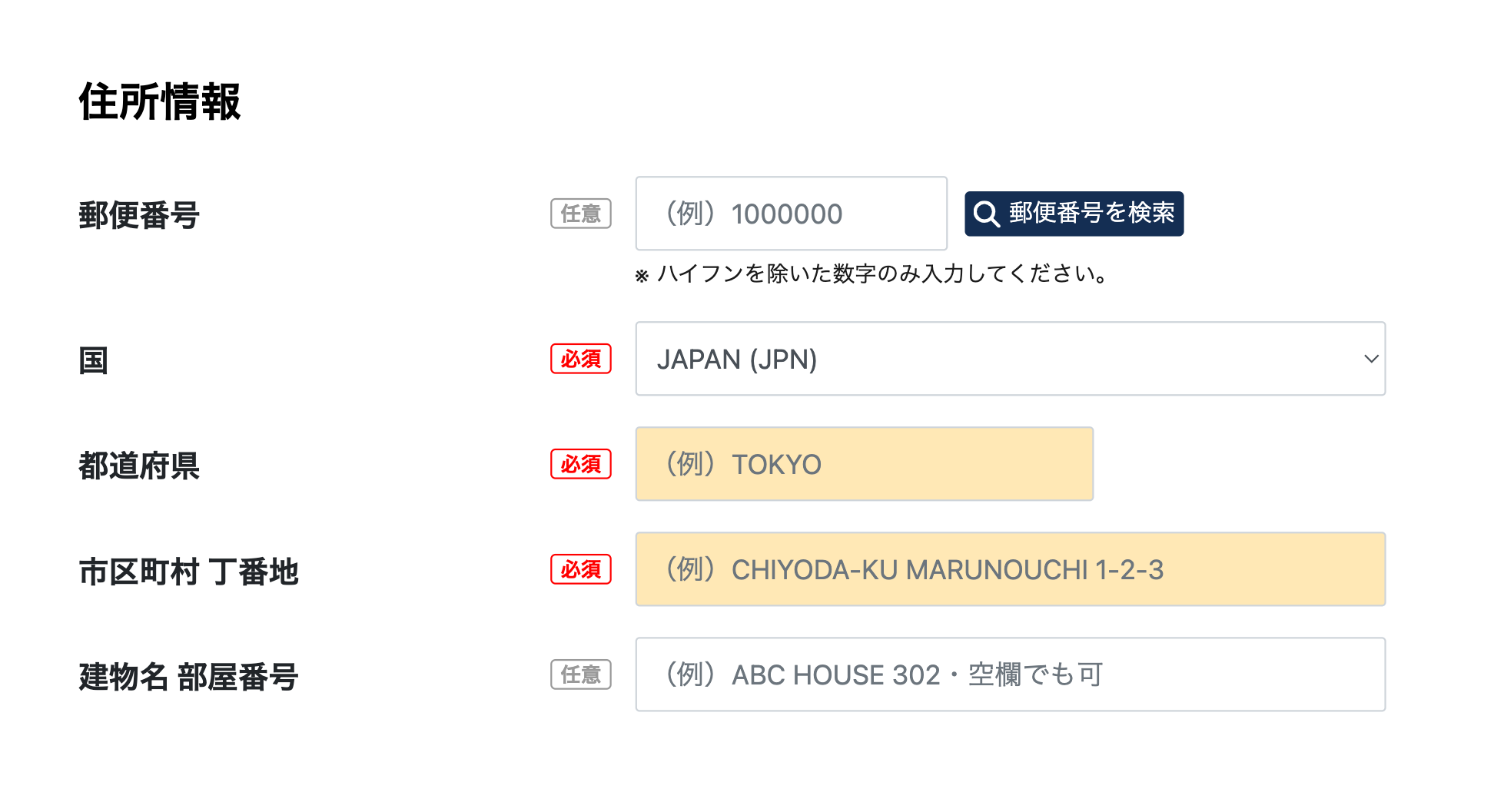 日本国内の住所については、郵便番号を入力することで都道府県と市区町村が自動で反映されます。