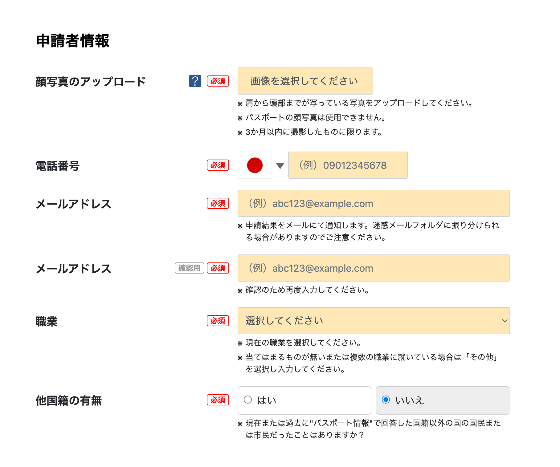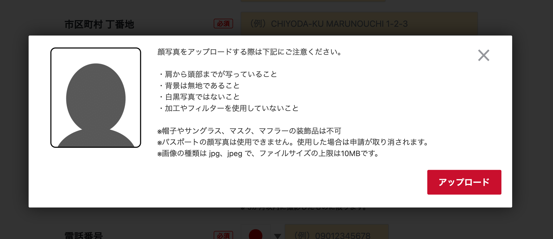 顔写真の画像データをアップロードしてください。 画像は肩から頭部までがはっきりと写っており、白背景で、カラー写真である必要があります。規定を満たしていない画像をアップロードした場合、申請が取り消されるためご注意ください。顔写真の条件や注意点については、こちらをご確認ください。