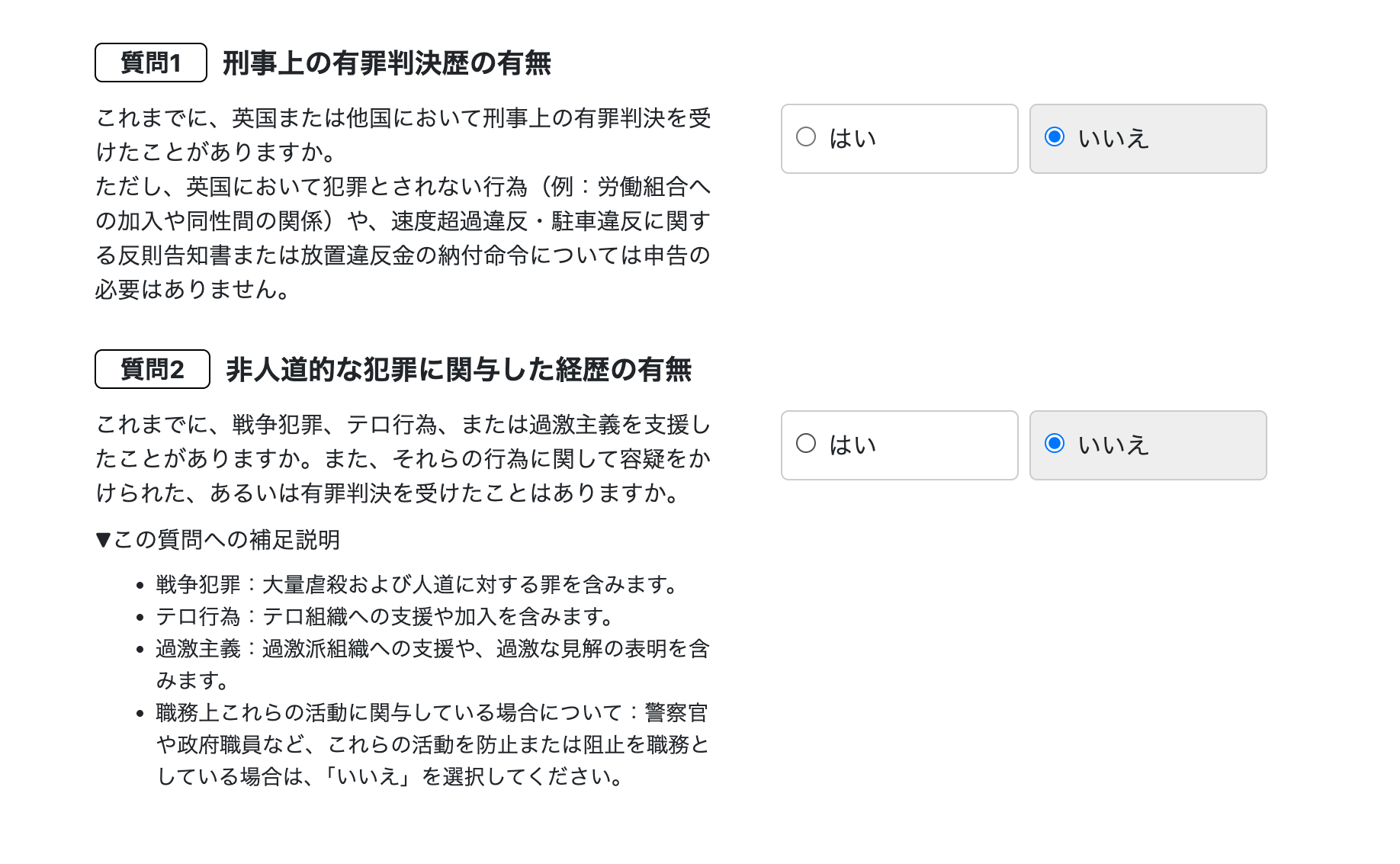 質問事項でいずれか1つでも「はい」に該当する場合は、ETAを利用してのイギリス渡航は認められません。質問内容をよくご確認のうえ、正確にご回答ください。