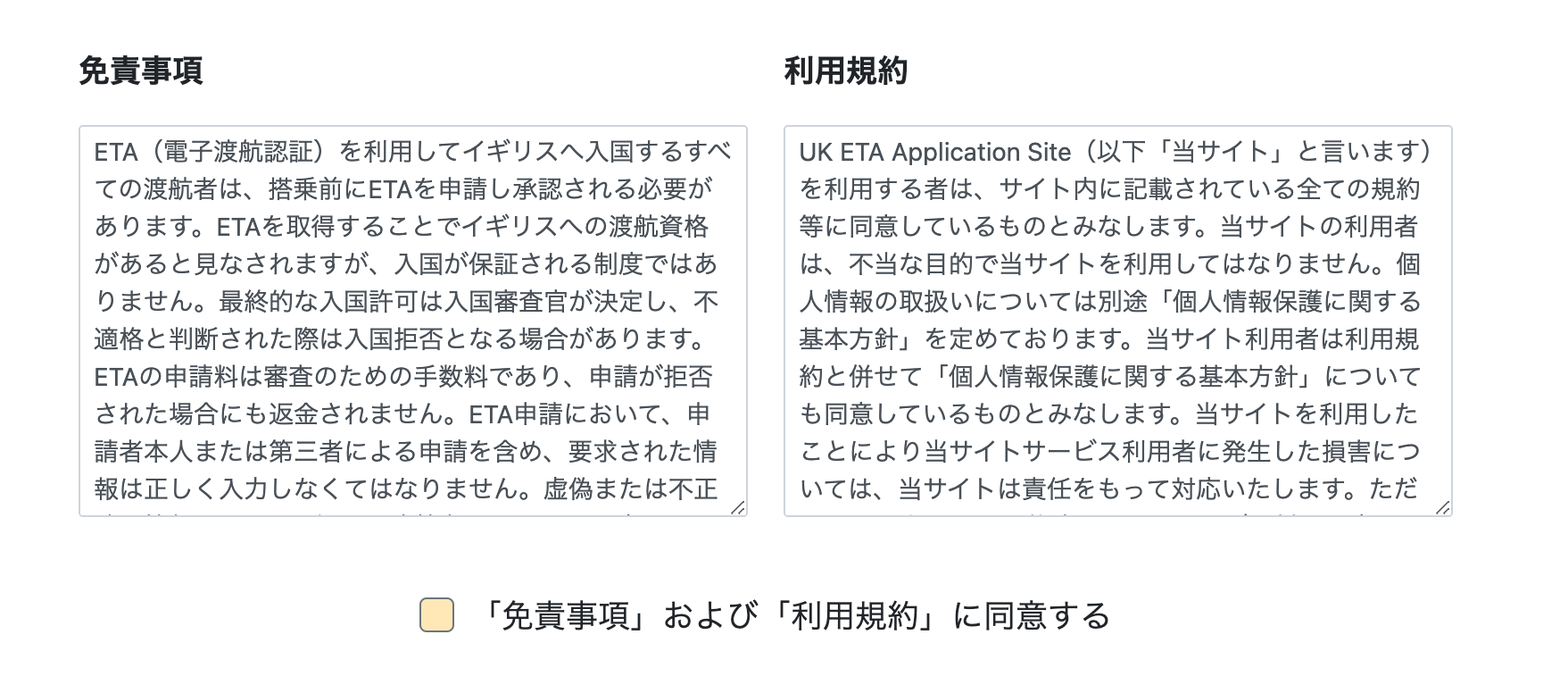 「免責事項」および「利用規約」の内容をご確認のうえ、「同意する」にチェックを入れてください。